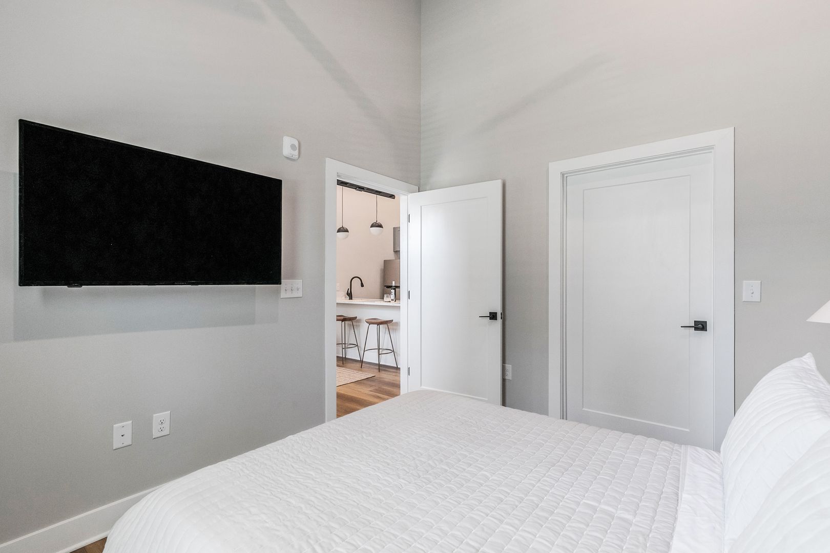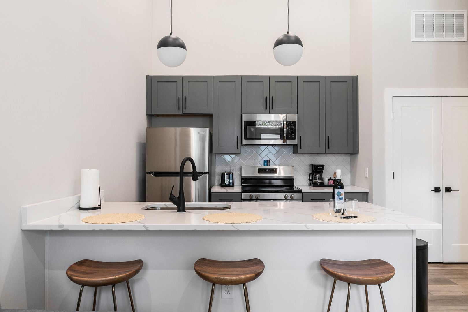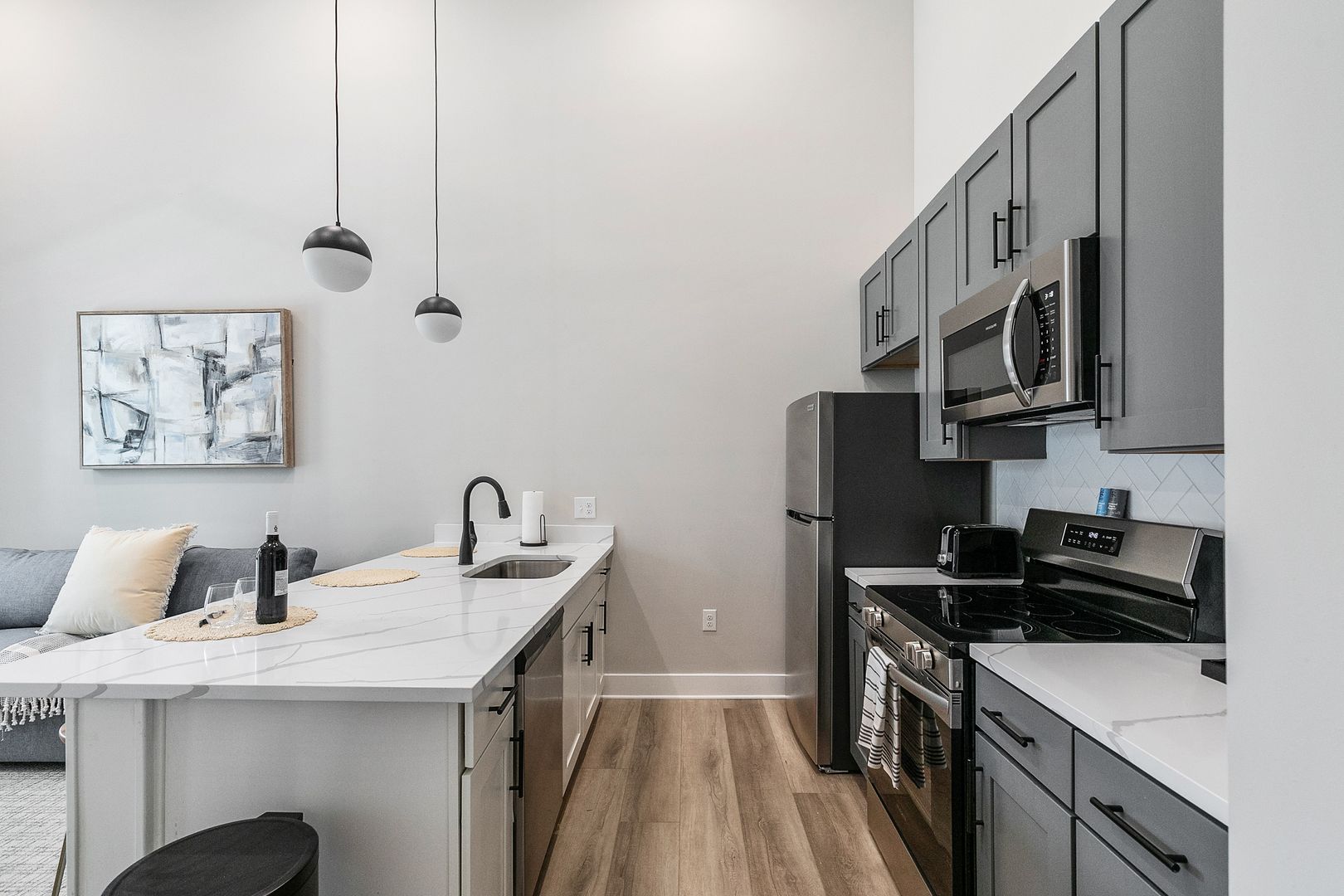 Enjoy a queen-size Leesa mattress in the bedroom and a queen-size pull-out sleeper sofa in the living room — perfect for guests. The kitchen is fully equipped with full-size appliances, cookware, dishes, and a kitchen island with seating for three.