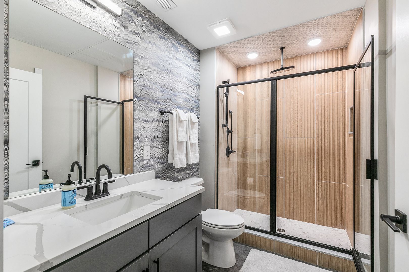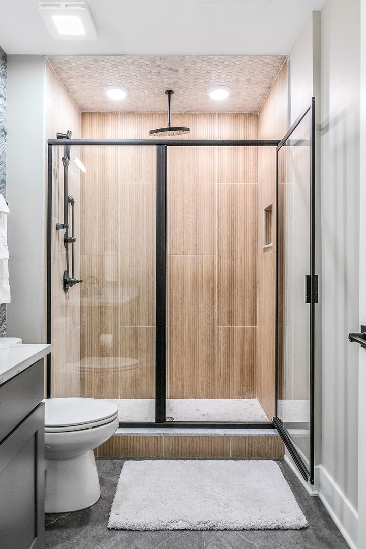Tiled bathroom with rainfall showerhead and luxury bath linens